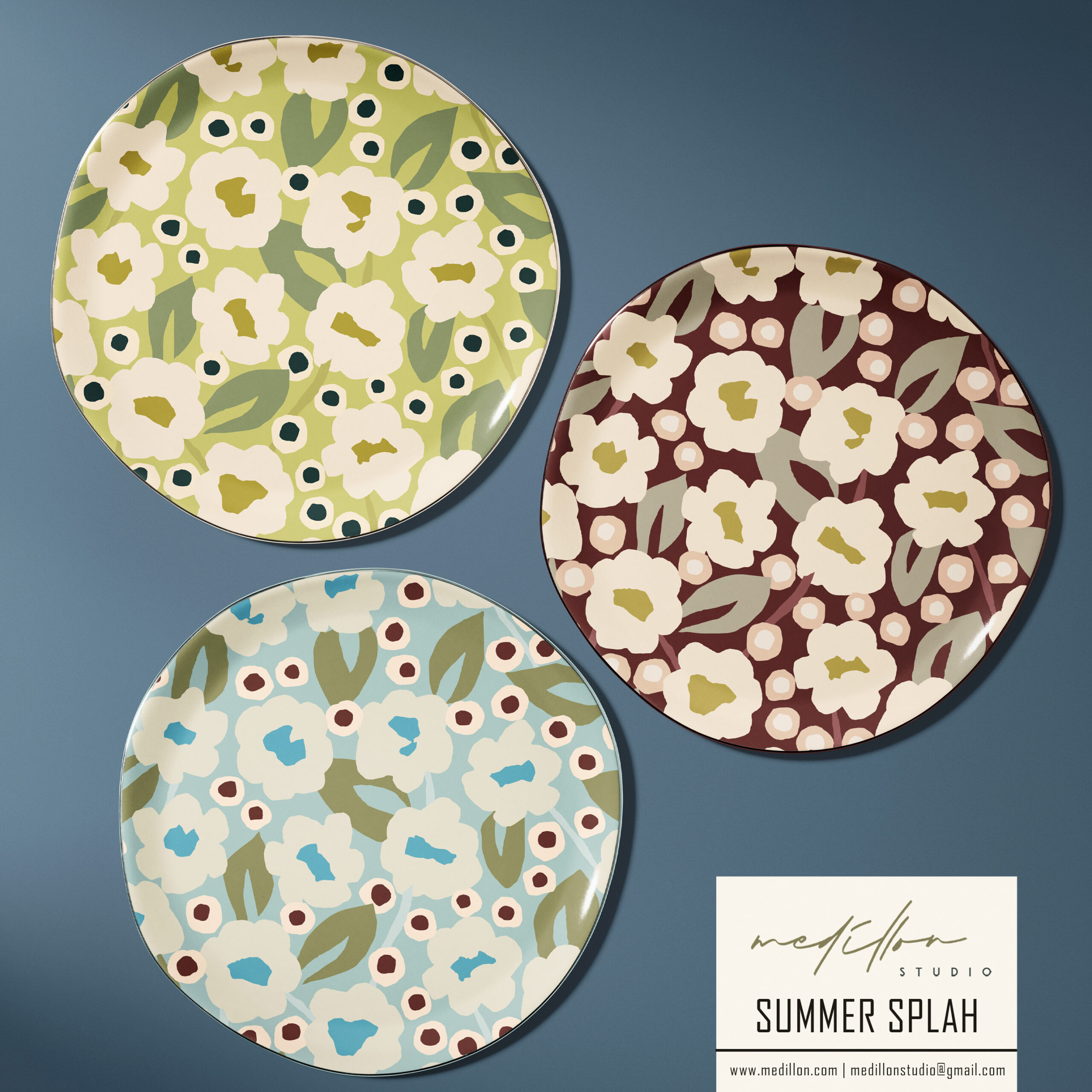 The color palette blends soft pastel blues, greens, blush, navy and brown giving the patterns a playful yet sophisticated feel. The abstract nature of the flowers, with their organic shapes and fluid lines, adds an artistic touch, making the designs feel whimsical and modern.